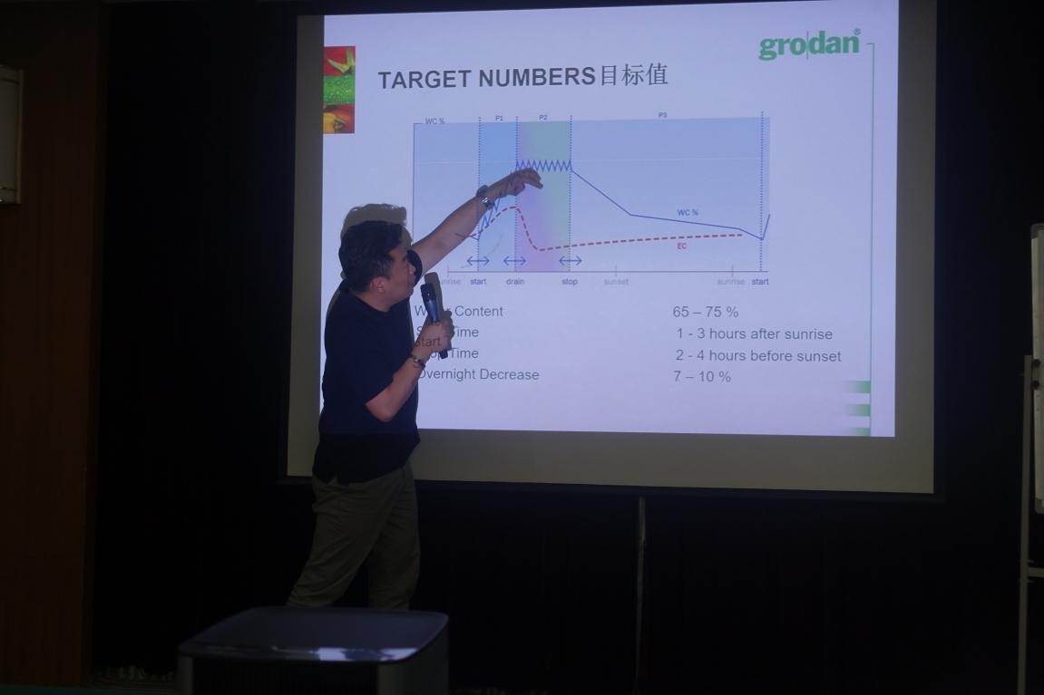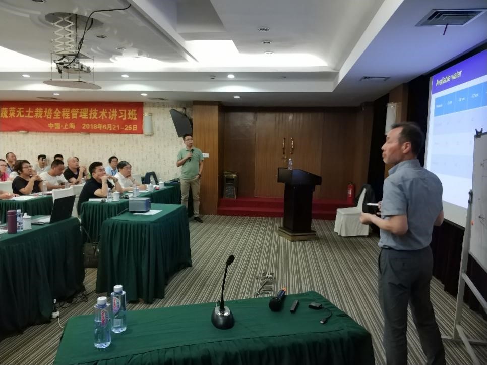 本次活动针对无土栽培蔬菜生产全程管理技术特聘请Grodan亚洲区无土栽培首席技术总监李康模(KangmoLee)、Agricns董事长李相墩(SangdonLee)、北京易农农业科技有限公司总经理董瑞芳、江苏绿浥农业科技股份有限公司总经理李勇等资深专家进行集中培训,几位专家从不同角度、详细讲解了基质特性、无土栽培的标准化理念,并重点讲解了辣椒及西红柿等作物的无土栽培生产管理要点等内容。